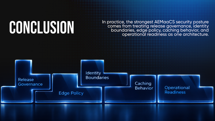 The practical path to strong AEMaaCS security is to treat operational controls as architecture: pipelines, identities, edge policy, and readiness practices.