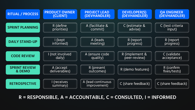 We also establish clear roles and responsibilities from day one. Every member knows what they own and how we collaborate. To make this crystal-clear, we often define a RACI matrix (Responsible, Accountable, Consulted, Informed) for our key workflows and rituals. Here’s an example of how roles map to common agile rituals in a DevHandler pod: