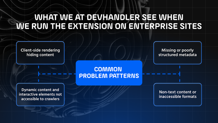 So, what does the extension actually uncover? In our use, it often confirms our suspicions: many visually impressive, JavaScript-heavy pages have shockingly low citation scores. The tool might say only 20% or 30% of the content is visible to AI, meaning the majority of the page (the product descriptions, pricing info, article text, etc.) never makes it to the AI’s index. In the enterprise context, these are frequently mission-critical pages – like product pages, support knowledge base articles, or thought leadership content – that aren’t being surfaced in AI answers at all. Next, let’s talk about what patterns we see repeatedly when we run the extension on enterprise sites, and why those issues occur.